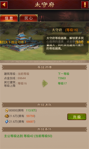 太守府的解锁需要主公等级满足特定条件,其等级越高,升级时的消耗就越大,相应地,通过点金获取的金币数量也会越多。