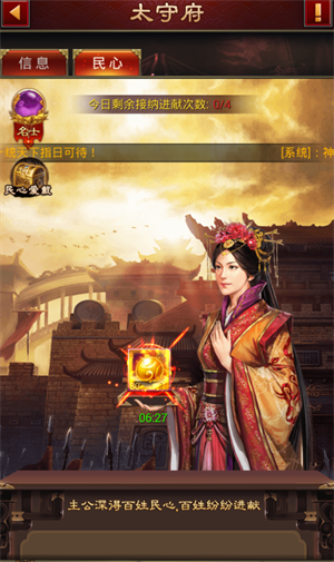 点击图标进入太守府后,能看到“信息”和“民心”两个页面选项。