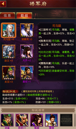 将军府是提升将领数量与属性的场所,设有信息和助战两个页面选项。