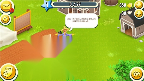 4、根据教程指引,点击小麦,选中镰刀,接着拖动镰刀收割全部小麦;