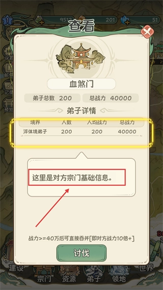 3、查看【血煞门】的宗门基础信息,掌握其弟子总数与总战力情况,经过评估后,再决定是否发起讨伐行动来扩张自身势力。
