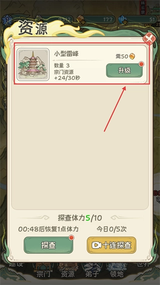 4、消耗50资源升级【小型雷峰】,可提高宗门每秒的资源获取速度,为宗门的长期稳定发展提供可靠的资源保障。
