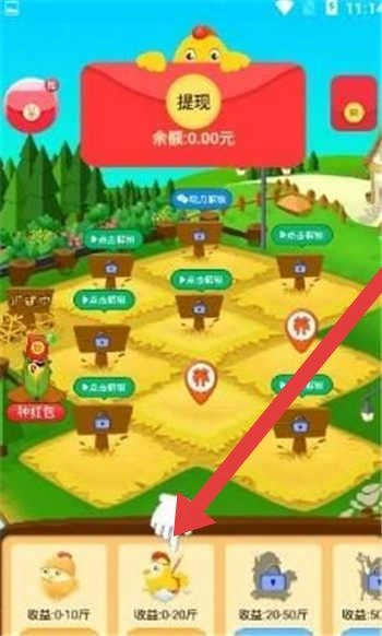 在农场界面,点击箭头所指的养殖区域(例如收益区间为0-20斤的区域),对家禽进行管理,完成相应的养殖任务,以此获取收益,进而增加可提现的余额。