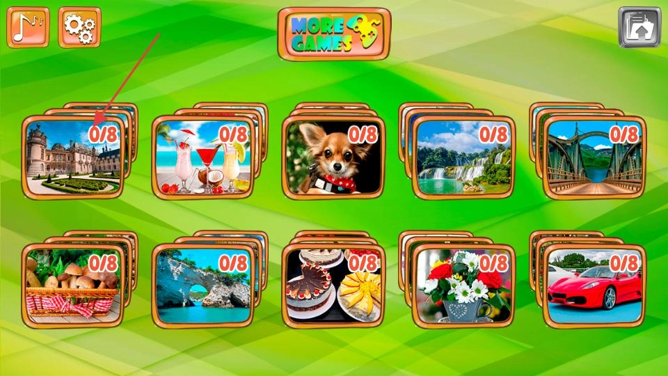 进入游戏的选关界面后,你会看到多组带有数字标识的拼图模块。找到箭头所指向的那个模块,点击它就能进入对应的拼图关卡,开启拼装挑战。