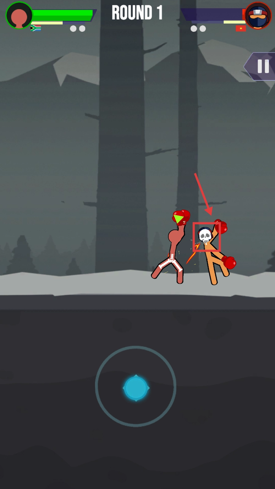 战斗时滑动底部的蓝色按钮,以此操控火柴人移动与出拳,和对手进行近身搏斗。