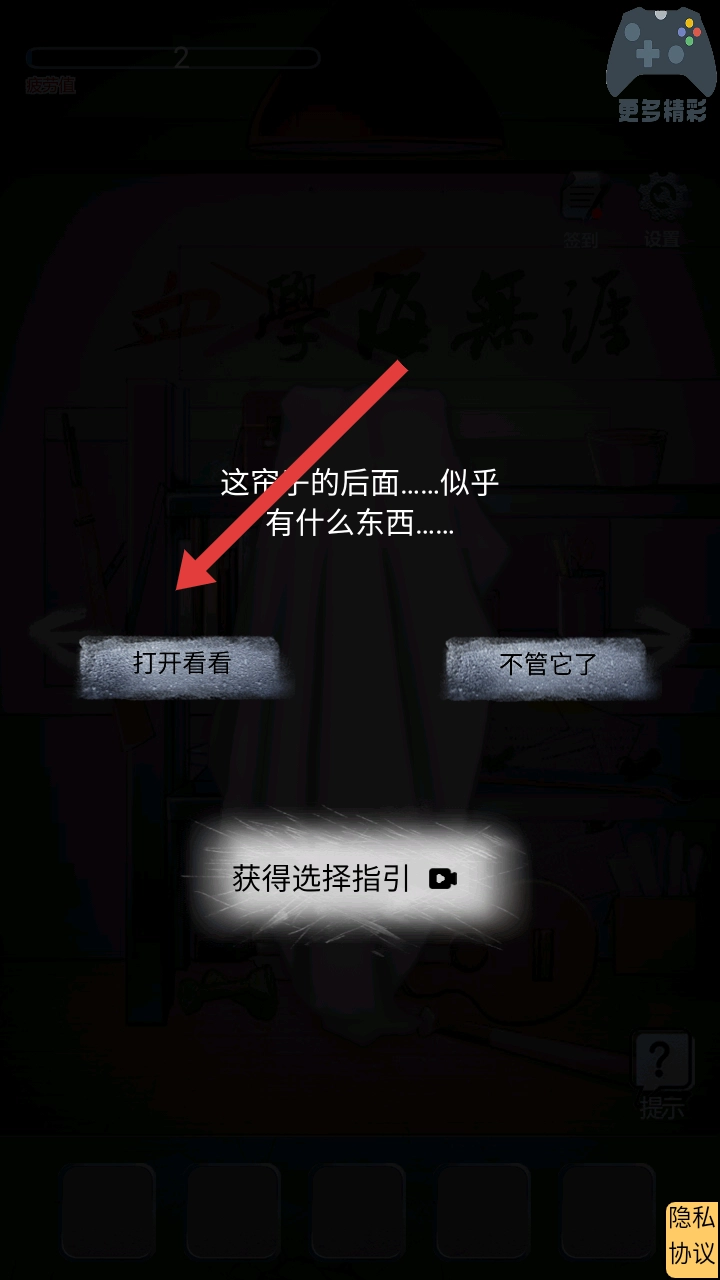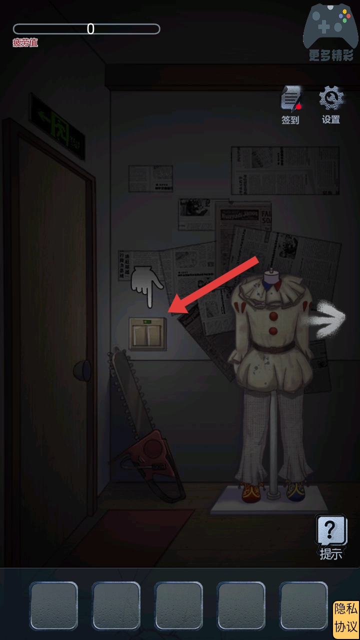 在角色藏身的房间场景里,得点击箭头所指的开关,开启这个房间的光源,有了灯光能更方便地搜寻线索。