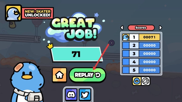 结算重玩:结束后会显示分数“71”,点击“REPLAY”按钮可以重新游玩以刷新成绩,还能解锁新角色。