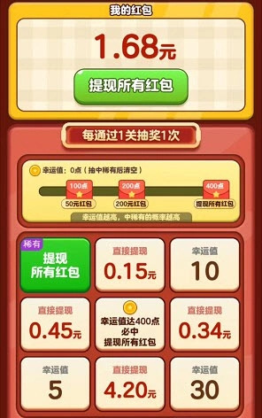 大多数时候可能只会抽中幸运值,凑够一定的幸运值可以兑换一些红包奖励,而不是直接能提现的。这个游戏正常提现应该是用金币兑换的吧,只是兑换比例起点非常低,要闯很多关才能提高比例。