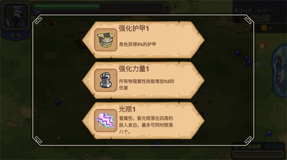 4、角色具备自动攻击功能,击败敌人后会掉落经验值,当收集的经验值达到一定数量时角色即可升级,升级时玩家能从三种能力里挑选其一。