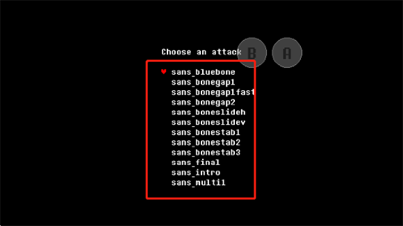 6、下图皆为“sans_bluebone”地图下的表现,触碰蓝色骨刺可恢复血量,触碰白色骨刺将失去血量