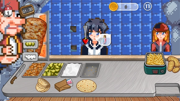沙威玛像素小店画面走的是复古的像素风格,看起来挺有特色的。在这个游戏里面,你的角色是一家沙威玛烤肉卷饼店的老板。你的任务就是制作各种口味的沙威玛来满足顾客的需求,让他们满意而归。游戏里,你得注意顾客的订单,确保沙威玛做得又快又好。随着生意越来越好,你可以用赚来的金币升级你的设备,提高效率,或者装饰店铺,吸引更多的顾客。