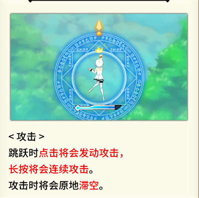 2、攻击:跳跃时点击将会发动攻击,长按将会连续攻击。攻击时将会原地滞空。