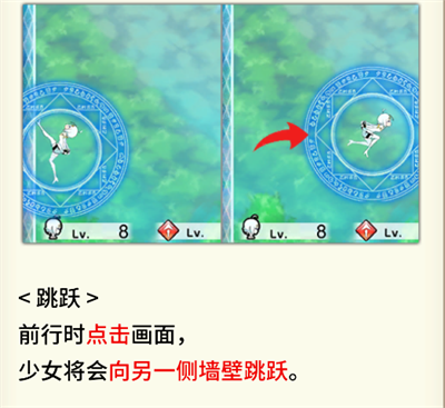 1、跳跃:前行时点击画面,少女将会向另一侧墙壁跳跃。