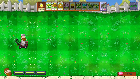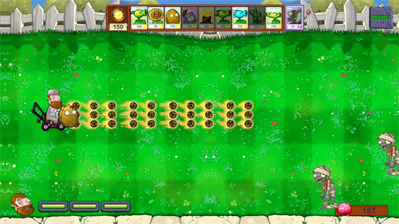 4、游戏界面的上方排列着可供使用的植物道具卡,消耗一定数量的阳光即可激活相应道具卡的效果。