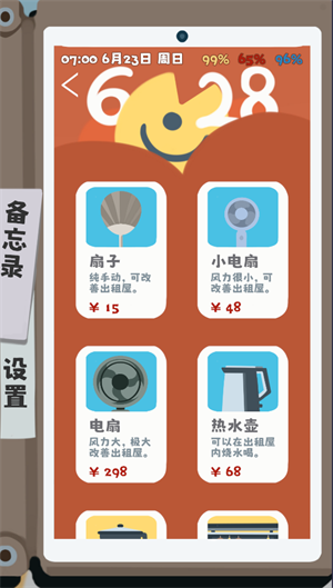 3、添置风扇道具,能让出租屋更显凉爽。其余道具可助力解锁部分选项。要是手头拮据,不妨在鱼多多平台售卖些物品。