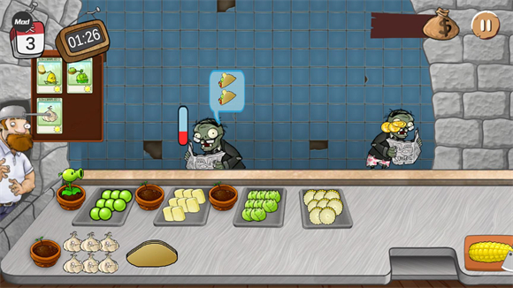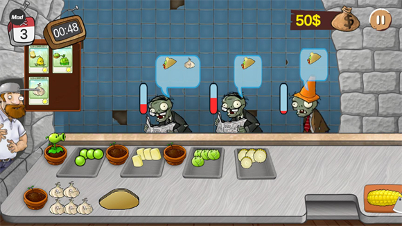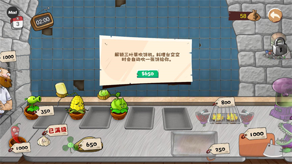 2、解锁三叶草后可以选择升级大蒜,再之后就升机枪和戴夫,再再之后烤阳光菇和辣椒酱二选一,这样可以让你完成更多的订单。