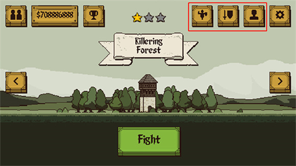 2、点击中间“Fight”即可开始游戏,上方从左到右依次为训练场、武器、人物;