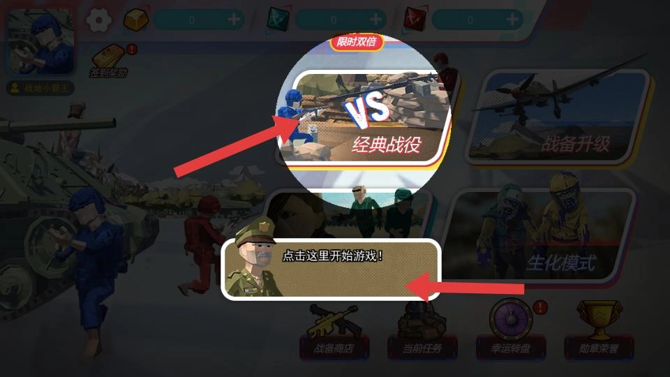 进入游戏后,首先映入眼帘的是包含经典战役等模式的界面,同时还有“点击这里开始游戏”的提示;点击该提示后,便会进入地图选择界面。