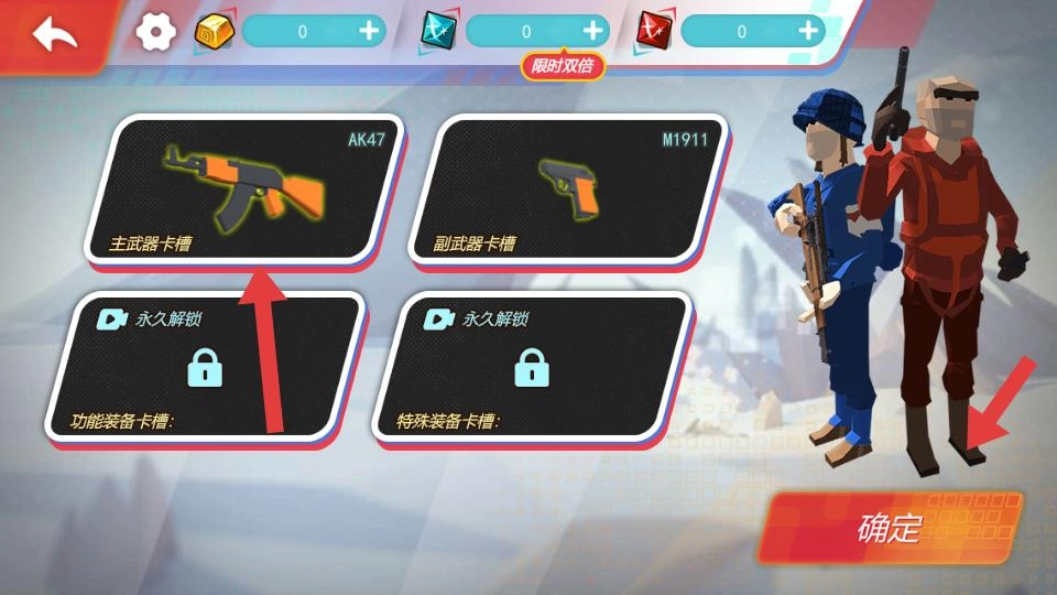 接下来进入装备选择界面,玩家可以挑选主武器、副武器等各类装备,确认选择完毕后点击确定按钮,即可准备进入战斗场景。