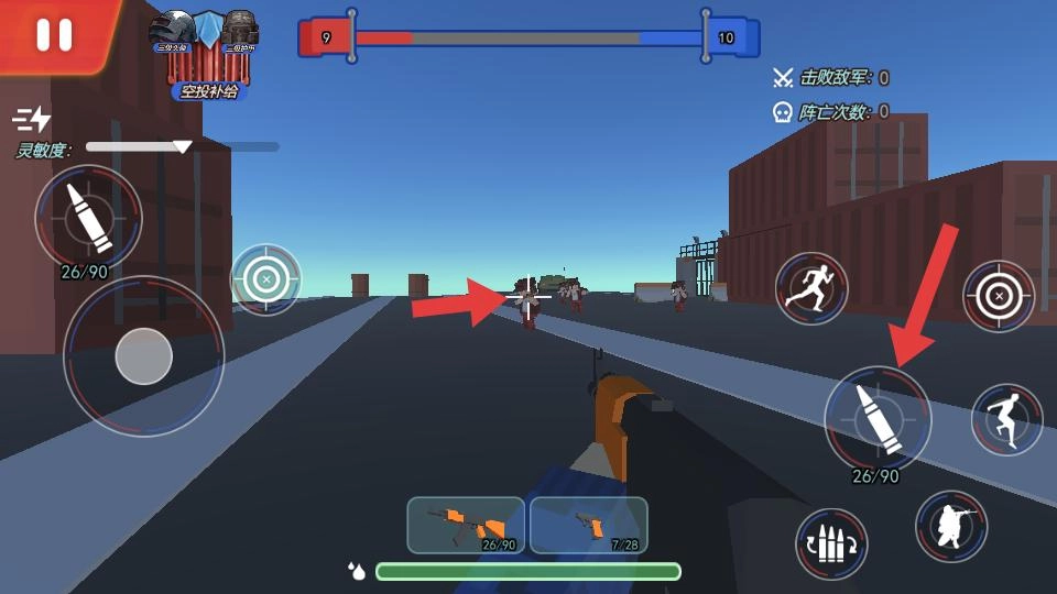 在战斗场景里,通过操作按钮来操控角色移动、射击,以此击败敌军、完成战斗任务,并且可以获得空投补给。