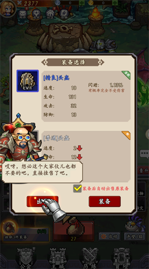 2、点击“出售”按钮可以售卖低级装备,成功售出后将获得经验值和金币。