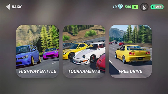 5、游戏包含公路战【highway battle】、锦标赛【tournaments】与自由驾驶【freedrive】三种模式,玩家能够自主选择体验,此处先以公路战模式为例进行说明