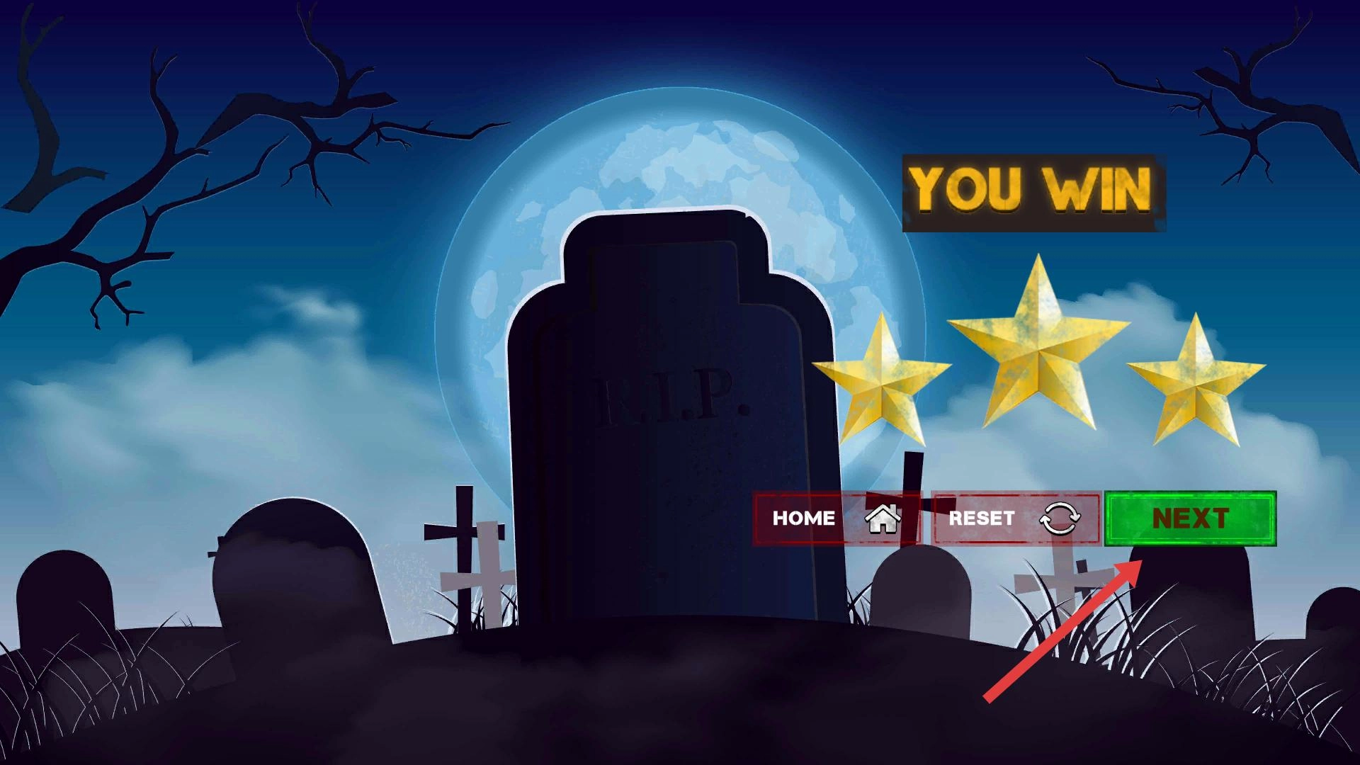 进入胜利界面后,可根据自身需求选择返回主页、重新挑战或是继续下一关,点击相应按钮即可推进游戏进程。