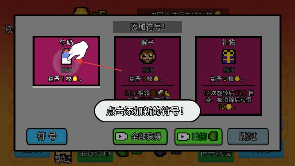 进入添加符号的界面,根据指引点击牛奶符号,把它添加到符号库,利用符号效果来获取金币,帮助支付房租。