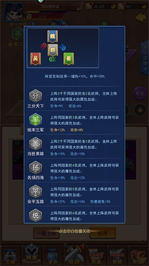 三分天下:同时上阵3个不同国家的武将,每个国家各2名,全体上阵武将将获得强力属性加成:生命值提升9%,攻击力提升6%