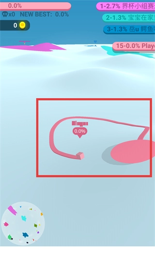 2、关卡中控制粉色纸片移动,通过覆盖场景区域来积累进度(界面显示“0.0%”等进度值)。