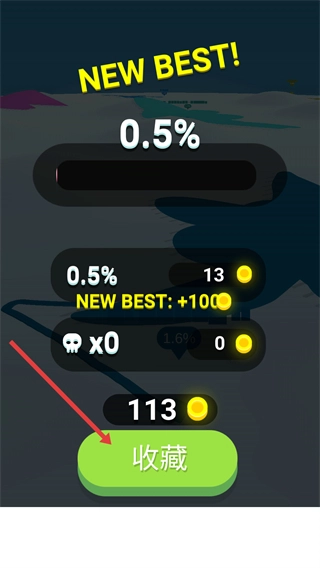 4、结束后界面显示“NEWBEST!”,点击【收藏】领取金币奖励,记录当前最佳进度。