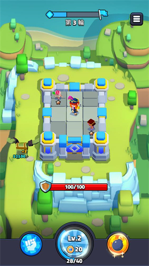 进入关卡后,角色会自动攻击出现的怪物,击败怪物可获得金币,点击下方中间的按钮就能召唤小兵。