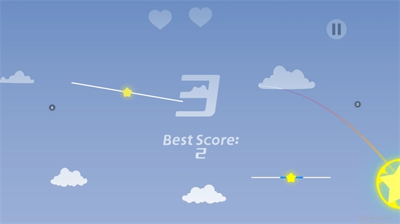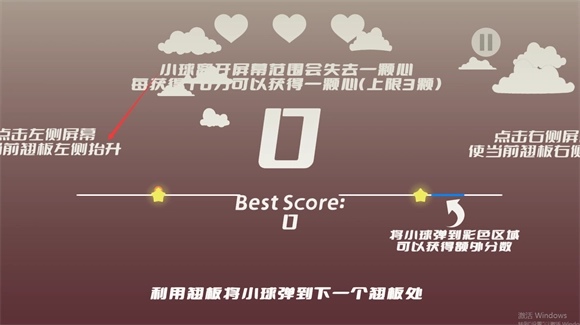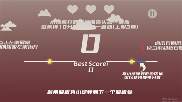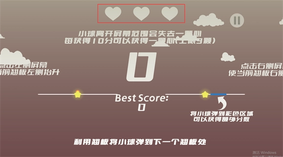 1、当小球移出屏幕边界时,玩家会损失一颗心;而每累计获得10分,就能额外获得一颗心。