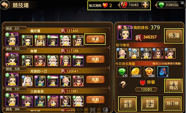 对战记录,会详细记载主公在竞技场中的每一场战斗情况,不管是对手主动挑战您,还是您主动发起对对手的挑战,都会被记录下来。通过这些记录,您能够轻松知晓自己的不足之处和优势所在,从而更有针对性地进行提升。