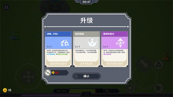 7、击败靠近的怪物可以获得金币和经验,获得经验可以升级,升级后可以选择一种技能强化自己。