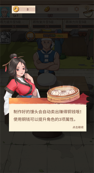 4、制作好的馒头会自动卖出赚得铜钱哦!使用铜钱可以提升角色的3项属性。