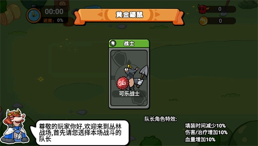 1、进入游戏后,首先需要选择你的鼹鼠战士,每位战士都有独特的技能效果