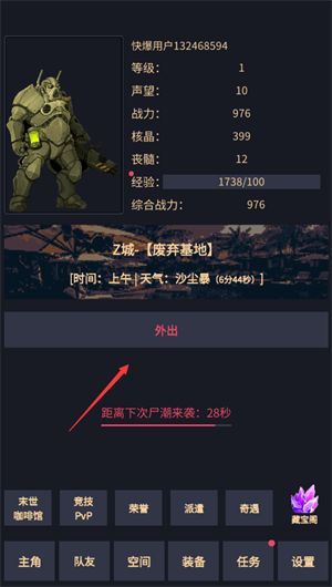 3、点击外出,离开废弃基地,去往市中心!