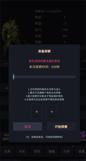 7、点击探索按钮,将招募到的伙伴派遣出去探索地图。(需要注意的是,正在探索的伙伴是不能参与战斗的)