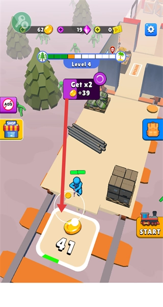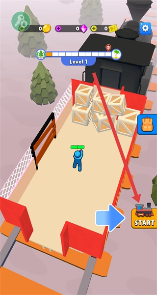1、在Level1界面点击START启动关卡,操控蓝小人清理车厢木箱,准备应对来袭敌人。