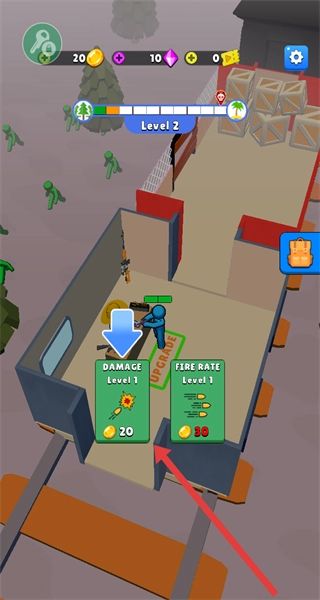3、在结束攻势后可消耗20金币升级DAMAGE属性,提升子弹攻击伤害,增强后续作战能力。