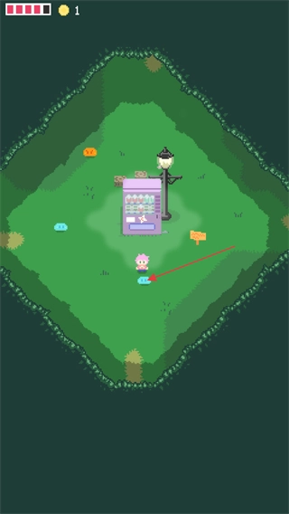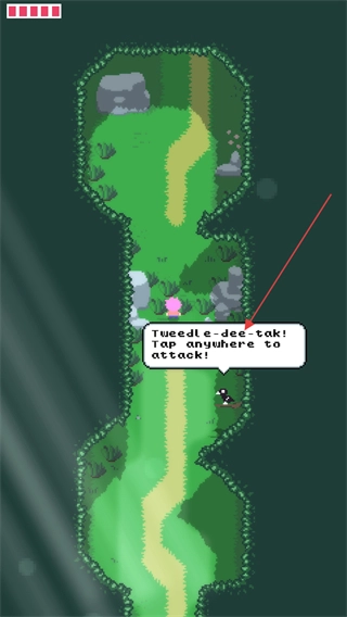 3、在当前场景里,移动角色靠近红色箭头所指的史莱姆,点击屏幕进行攻击。
