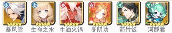 1、新手推荐阵容:暴风雪、生命之水、牛油火锅、冬阴功、箭竹饭、河豚君