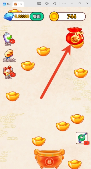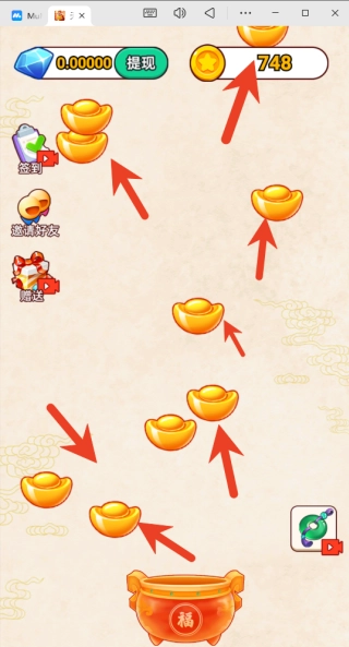 2、只需用手指在屏幕底部左右滑动,就能操控您的角色随之移动,同时尝试精准对准从屏幕上方持续掉落的金元宝、铜钱等代表财富的道具。