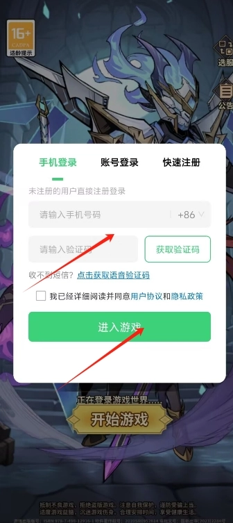 1、玩家只需通过手机号加验证码的方式完成信息注册与身份验证,就能快速进入游戏开启精彩的冒险之旅。