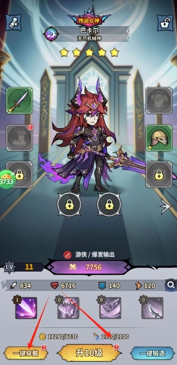 3、玩家点击升级按钮后,能够消耗特定数量的资源来增强角色的攻击力、防御力、生命值等技能属性,并且可以通过一键操作让英雄穿戴装备,从而提升角色等级。