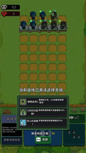 5、摆放时按照从上到下的顺序来,第二排和第三排不要放置二级角色。在布置阵型的同时开启增益效果,增益优先选择吸血类的,其次可以考虑血矿获取速度相关的;要是关卡里没有反伤类型的怪物,就选攻速增益;如果实在没有合适的选项,再考虑防御或者血量类的增益。