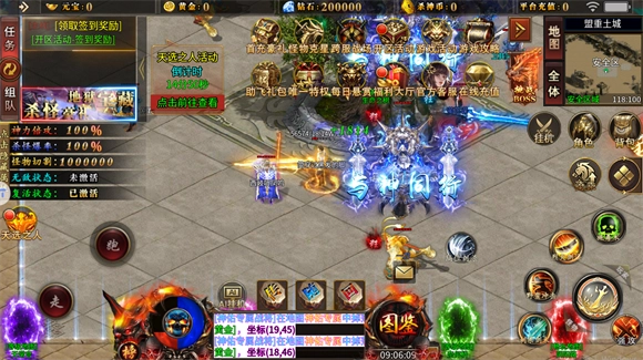 3、神器BOSS每30分钟会刷新一次,要是当前没有神器BOSS可挑战,大家可以去打野外BOSS或者在高爆地图挂机!同时记得积攒进入4大陆所需的材料,等到达4大陆后,要积极参与炼魂地狱活动!