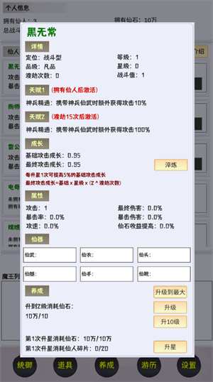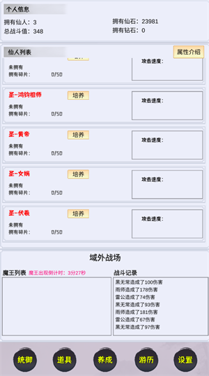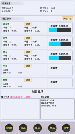 1、养成大仙:玩家可以培养上古大仙,通过不断的修炼和战斗,提升他们的能力,最终击败域外天魔,保护仙界的安宁。