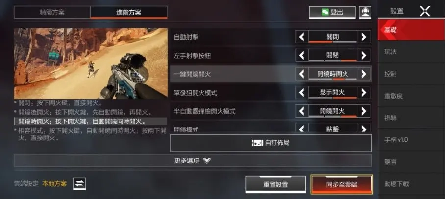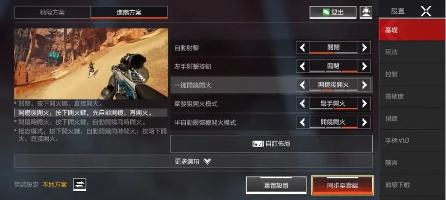 二者各有优劣,按自己的习惯挑选就行,要是4指及以上操作的玩家,能把一键开镜功能关掉,给瞄准和开火操作腾出位置。